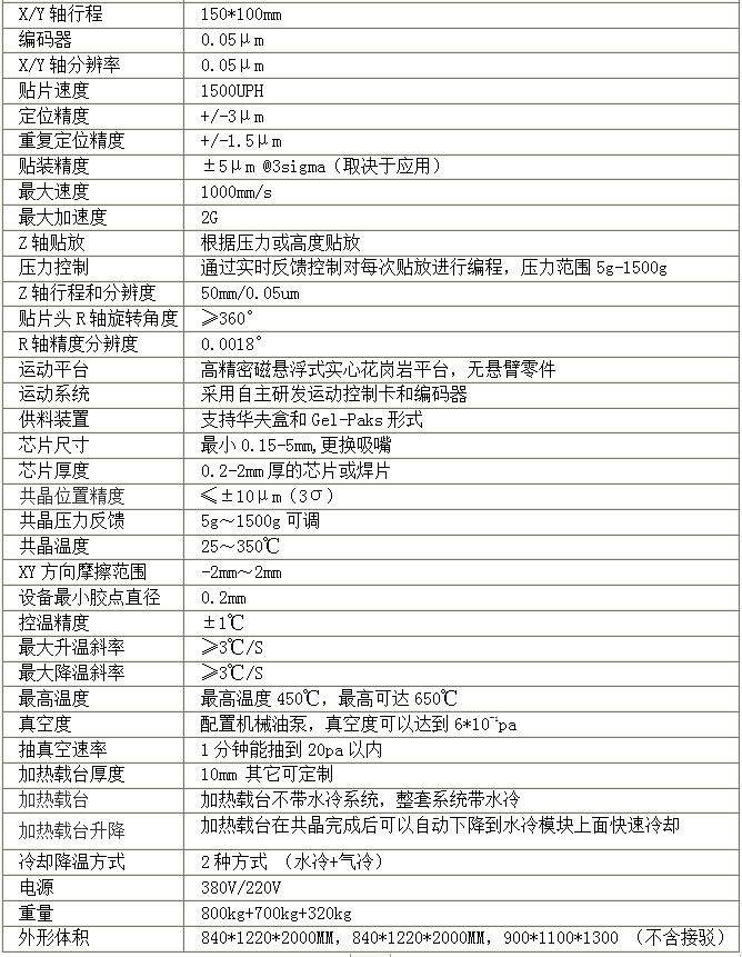 1、適用于半導(dǎo)體集成電路生產(chǎn)過程(后道封裝)中片式元器件貼裝,也可實現(xiàn)功率芯片與封裝器件自動裝配功能、可自動貼裝、共晶、點膠、蘸膠、粘片、晶圓粘片、倒裝、GaAs,粘片壓力可編程控制,精度高。 2、采用精密磁懸浮運動平臺,主系統(tǒng)X、Y軸采用帶有高解析度直線編碼器的無接觸無摩擦 磁懸浮系統(tǒng)。編碼器刻度達0.02μm精度,可實現(xiàn)高速、精密、亞微米級的定位。 3、平臺的設(shè)計采用高穩(wěn)定的花崗巖一體化高速運動平臺,使KV800在保證熱穩(wěn)定和機械穩(wěn)定 的同時,實現(xiàn)高速啟動時間和+/-0.5μm乃至更好的貼片精度,從而滿足高精密的應(yīng)用要求。 4、具備獨立的點膠控制軟件進行膠水形狀和路徑的任意設(shè)置,可以實現(xiàn)點、線、平面、非 平面、弧形、圓形等任意形狀的點膠。同時配置獨立的點膠控制器。點膠控制器有獨立的算法, 膠水多的時候,氣體壓力會根據(jù)算法自動加大。膠水少的時候,氣體壓力會根據(jù)算法自動降低壓力。實現(xiàn)膠水點膠的一致性。 5、圖像識別系統(tǒng)包括兩組獨立的識別系統(tǒng)。頂部系統(tǒng)配置兩組獨立的工業(yè)相機,實現(xiàn)電路 板MARK點、焊盤的識別,底部系統(tǒng)配置超精密的工業(yè)相機,配置10種以上的圖像識別算法,可 以實現(xiàn)相關(guān)原材料包括特征點、管腳、芯片MARK點、異形件、小型基板等精密識別。 6、貼片機具備自動校準功能,在使用時可以根據(jù)要求設(shè)置多少次運動之后自動進行X Y軸運 動精度的校準,也可以在發(fā)現(xiàn)設(shè)備定位不準確時,通過三維自動校準進行運動軸的校準。同時通 過底部圖像識別系統(tǒng),進行點膠機點膠針頭和吸嘴的自動校準。 7、旋轉(zhuǎn)角度:設(shè)備配置高精密DD馬達,具備360度旋轉(zhuǎn)功能,旋轉(zhuǎn)分辨度為0.001度,可以實現(xiàn)組裝過程中任意角度的芯片貼裝。 8、設(shè)備配置精密點膠機,通過軟件可以選擇用點膠1或2